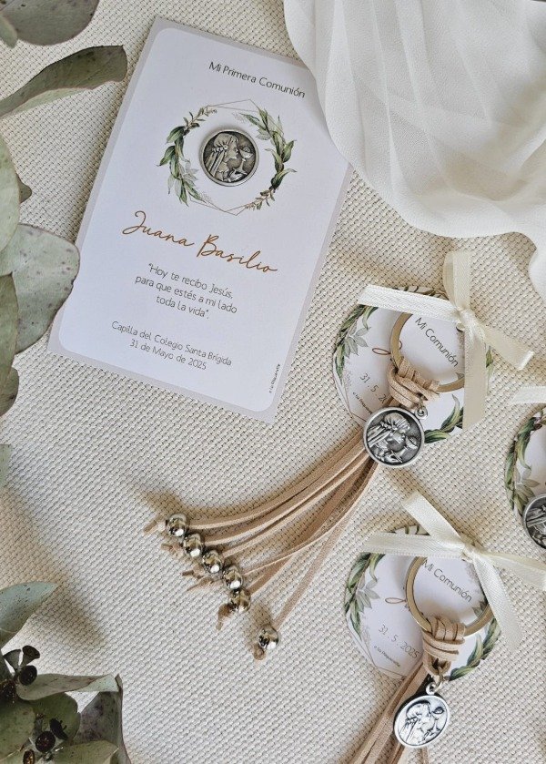 Además, lo acompaña una estampita impresa en papel ilustración de 300 g, con aplicación de medalla de Comunión, para atesorar ese momento tan especial.
