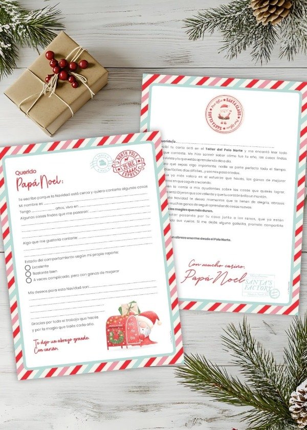 – Carta del niño/a para Papá Noel, con espacios para completar, contar cómo fue su año y marcar su propio “reporte del comportamiento”.